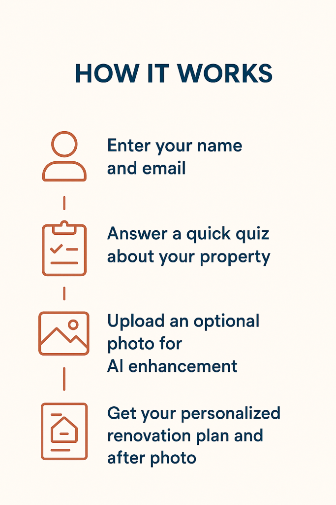 Discover how Propertify turns your property’s data — and even an old photo — into a personalized data driven renovation suggestion with cost estimates, ROI projections, material & brand suggestion and an AI-generated “after” image. START MY PROPERTY ANALYSIS